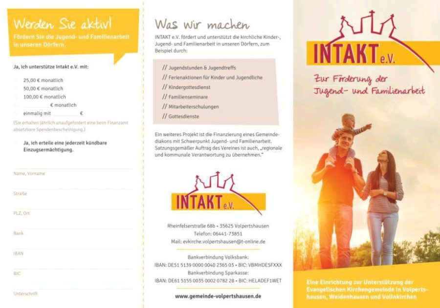 Es war eine richtige und gute Entscheidung! Seit 10 Jahren gibt es INTAKT! Voller Unsicherheit saßen wir im Presbyterium und haben gemeinsam überlegt, was wir tun können, um christliche Jugend- und Kinderarbeit in unserer Dörfern weiterhin anbieten zu können. Die ehrenamtlichen Mitarbeiter waren vorhanden, konnten aber durch schulische, berufliche oder auch persönliche Veränderungen eine kontinuierliche Arbeit nicht gewährleisten. Vom Kirchenkreis gab es wenig Unterstützung für unsere Idee, dass Jugendarbeit vor Ort geschehen muss. Daneben war uns eine christliche Ausrichtung der Arbeit wichtig. So trafen wir eine gewagte Entscheidung: Wir gründeten einen Ver-ein, der die Jugendarbeit der Kirchengemeinde Vollnkirchen, Volpertshausen und Weidenhausen unterstützt. Dieser Verein sollte eine hauptamtliche Kraft einstellen, die in unseren Dörfern tätig ist. Finanziert werden sollte die Arbeit durch Spenden und Zuschüsse.